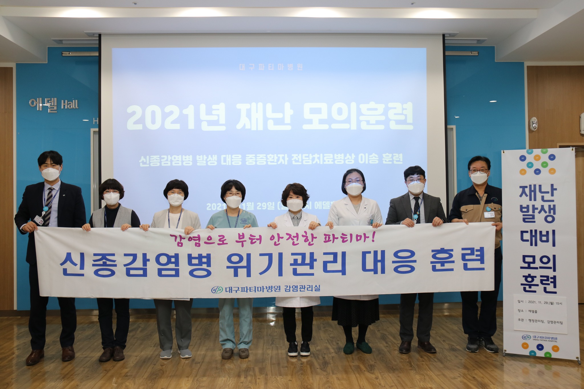 시키고 방역대책을 강화하는데 중점을 두었습니다. 대구파티마병원은 재난발생대비 모의훈련 등을 통하여 항상 사전에 준비된 자세로 감염병과 같은 재난이 발생 시 효율적으로 대응하여 감염 확산 방지 및 예방을 위해 최선을 다하겠습니다.