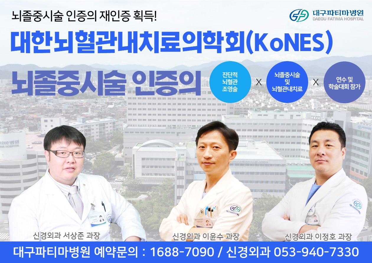 대구파티마병원 신경외과의 서상준, 이윤수, 이정호 과장이 대한뇌혈관내치료의학회(KoNES)로부터 뇌졸중시술 인증의로 재인증을 받았습니다.