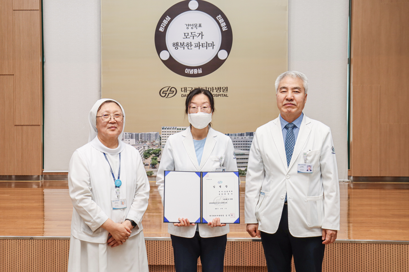 이어 인사 발령이 이어졌다. 감염내과 홍정민 과장이 오는 10월 1일 자로 감염관리실장에 임명됐으며, 신장내과 김동언 과장이 9월 1일 자로 부임했다. 또한 방사선종양학팀 김미선, 안전보건팀 도미희, 핵의학팀 손상준이 새롭게 팀장으로 임명되었으며, 방사선종양학팀의 도태현, 핵의학팀 백민정, 총체적질관리실 권길주, 간호본부 기을숙(Sr. 여호수아)이 새롭게 UM 직책을 맡아 임명장을 받았다.